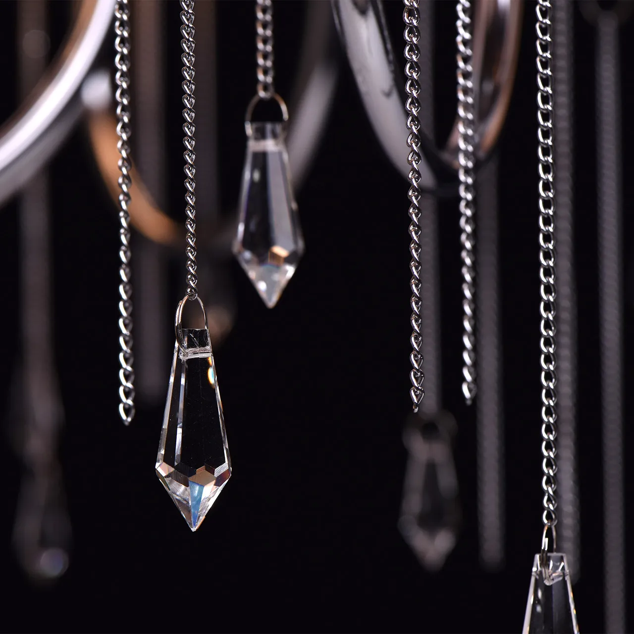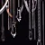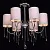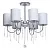 Металлическое основание цвета хрома, текстильные абажуры нежно-серого цвета, декоративные подвески и